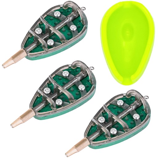 Koszyczki do method feeder + forma. Koszyczki mają środek bez poprzeczki dzięki temu haczyk się nie zaczepia. Wyposażone w krętlik i silikonową końcówkę.
