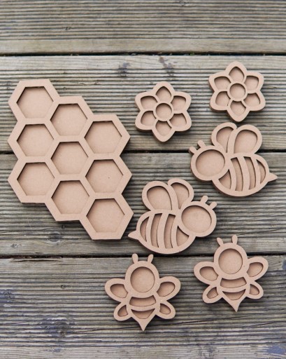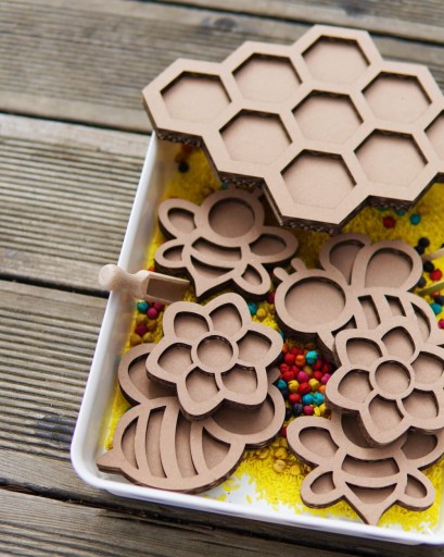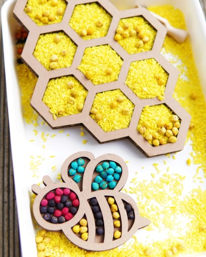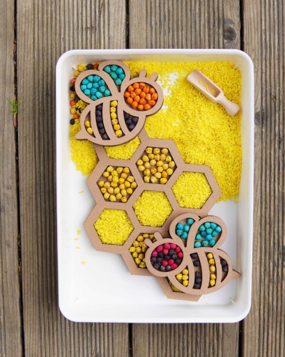 Masę i ziarenka przesyp do pojemnika, ułóż kwiaty oraz pszczółki i tak przygotowane daj dziecku do zabawy.