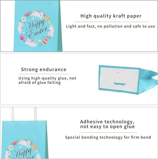 - Torebki papierowe wielokrotnego użytku: te torebki na prezenty mogą być używane wielokrotnie. Bardzo dobrze nadaje się na przekąski, ciastka, słodycze, popcorn, czekoladę i inne małe prezenty. Wspaniały sposób na zabranie prezentów wielkanocnych dla dzieci. Używany do dekoracji wielkanocnych.