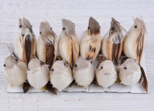 Ptaszki wielkanocne z naturalnym piórkami. Do nóżek mają zaczepione druciki, dzięki czemu można przymocować je na koszyczku, drzewku wielkanocnym lub wiosennym.