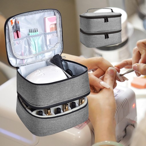 - Dwuwarstwowa torba do przechowywania paznokci Organizer Przenośna kosmetyczka Szara