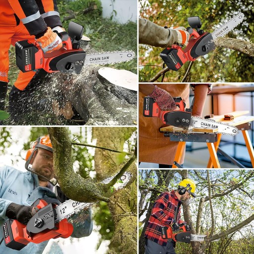 12-calowa ręczna pilarka zasilana akumulatorem ma ergonomiczną i lekką o wysokiej wydajności, bardzo małe wymiary i urządzenie, sterowanie, obsługa i większa sieć pracy, a także może być używana na drzewach, uruchamiana bardzo szybko, lekka, ale mocna, obsługa jednej pomocy w celu łatwiejszej i bezwysiłkowej pracy, dzięki czemu jest to rozwiązanie proste do wyjścia z domu, gospodarstwa rolnego, ogrodu i użytku domowego. Maksymalna wielkość cięcia wynosi 250-300 mm. prędkość obrotowa silnika wynosi 23000 obr/min. W razie potrzeby akumulatorowa pilarka łańcuchowa jest wyposażona w system smarowania, trwały dopływ oleju do przewodów i przełączników w celu bezpiecznego i końcowego użycia, co pomaga wydłużyć używania piły łańcuchowej. Zapewnia ostrzał, który ma zęby tnące pod prostym, późniejsze działanie i końcowy czas użycia.