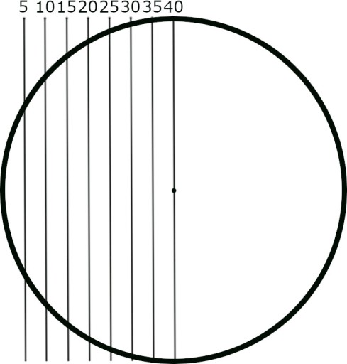 Lustro o średnicy 70 cm docinamy na poniższych odległościach od krawędzi: