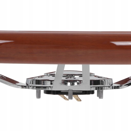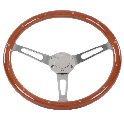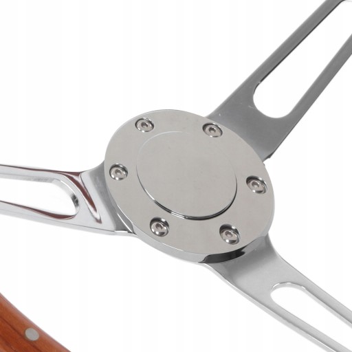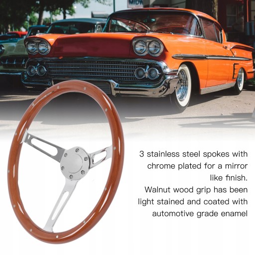 3. Trwała konstrukcja: 3 szprychy ze stali nierdzewnej z chromowanym wykończeniem, zapewniającym lustrzane wykończenie. Uchwyt z drewna orzechowego został lekko bejcowany i pokryty emalią samochodową.