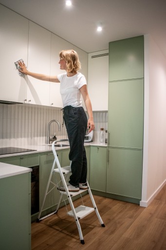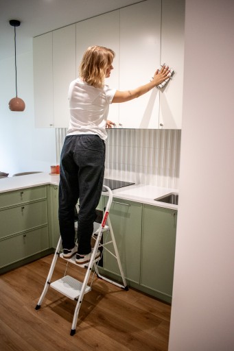 Drabinka do kuchni posiada poszerzone, karbowane i antypoślizgowe stopnie o wielkości 30 x 20 cm.