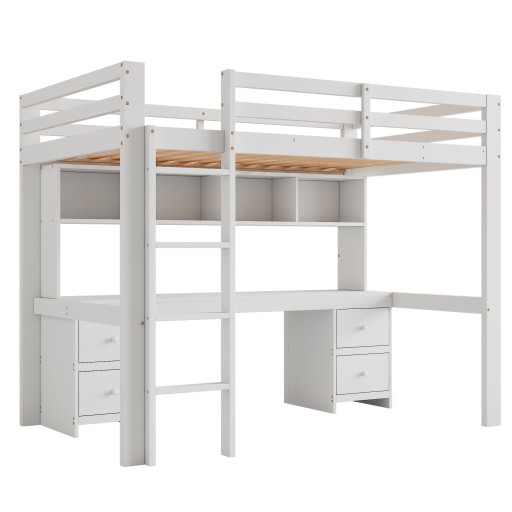 Łóżko na antresoli 90*200cm, łóżka dziecięce, łóżko górne, stolik dolny, duża przestrzeń do przechowywania, wysoka poręcz, stabilne schody, Biały