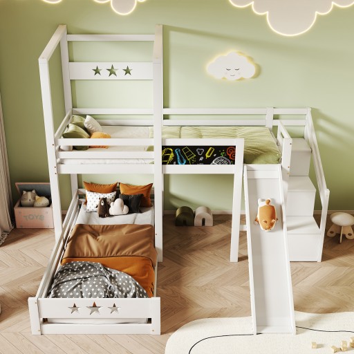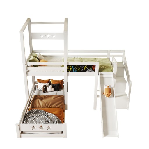 Łączenie praktyczności i kreatywności: Górne łóżko wyposażone jest w tablicę, na której dzieci mogą malować kolorową kredą, aby dodać kolorowy element do białego łóżka. Z boku znajdują się trzy otwarte schowki o różnej wielkości miejsca do przechowywania dla różnych rodzajów Wyświetla.
