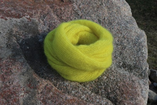 Delikatny jak chmurka komin typu pętla ręcznie wydziergany z ekskluzywnej przędzy o doskonałym składzie (70% Super Kid Mohair 30% jedwab) w cudownym żółtym kolorze przechodzącym w stronę żółtej limonki.