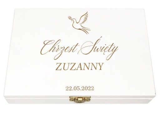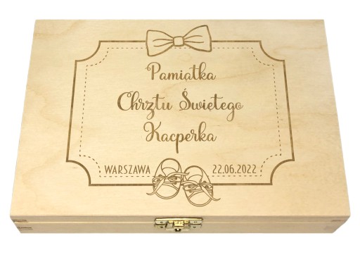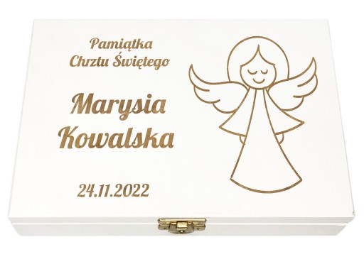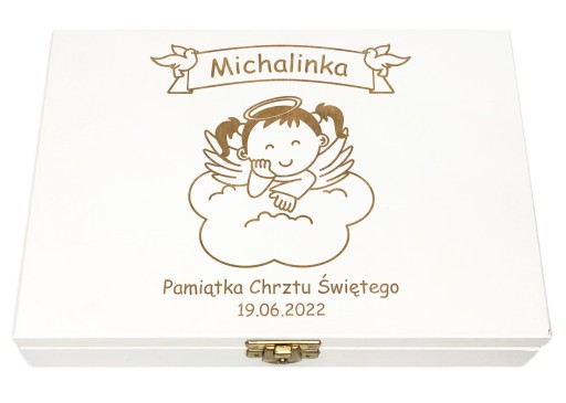 Drewniane pudełko z grawerem idealnie sprawdzi się jako prezent na Chrzest Święty dziecka. W komplecie znajdują się sztućce ze stali nierdzewnej z tłoczonym motywem misia, zachęcające dziecko do nauki posługiwania się wszystkimi elementami zestawu.