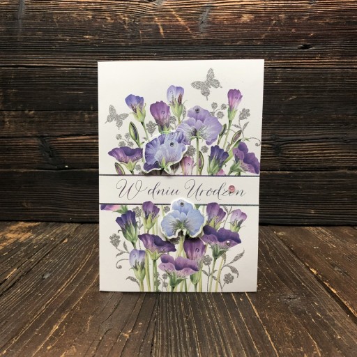 Kartka z życzeniami urodzinowymi zdobiona folią metalizowaną i brokatem, z naklejanymi elementami. W zestawie kolorowa, elegancka koperta.