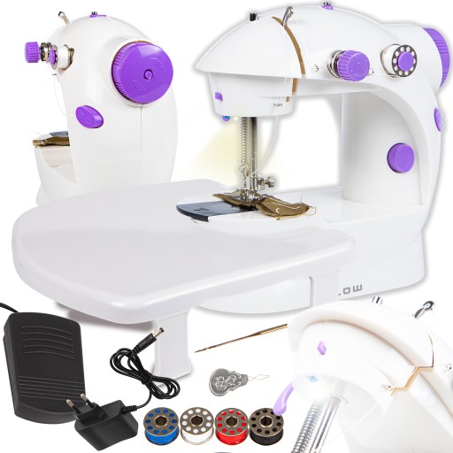 MASZYNA DO SZYCIA PRZENOŚNA MINI AKCESORIA PODŚWIETLANA NA BATERIE ZASILACZ + STOLIK