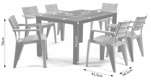 Zestaw Julie 6+1 świetnie sprawdzi się na tarasie jak zestaw jadalniany dla 6 osób. Stół ma kompaktowe wymiary blatu 147x90 cm. Jest mniejszy niż standardowy stół obiadowy na 6 osób, przez co docenią go właściciele niewielkich przestrzeni.