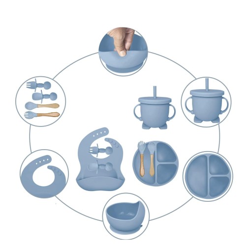 Nasz talerz dla dziecka zawiera wszystko, czego potrzebujesz, w tym 1 regulowany silikonowy śliniaczek, 1 talerz dla dziecka z przyssawką, 1 miskę dla dziecka z przyssawką, 1 kubek, 2 łyżki i 2 widelce. Talerzyki dla niemowląt z przyssawkami są odporne na ciepło i zimno, można je używać w piekarniku i kuchence mikrofalowej oraz można je przechowywać w lodówce i zamrażarce. Każdą część można myć w zmywarce, co oszczędza czas i pozwala spędzić więcej czasu z dziećmi.