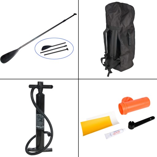 W zestawie: Torba Funkcjonalna torba, bez problemu pomieści deskę, pompkę oraz wiosło. Pompka Pompka nożna, można nią łatwo i szybko napompować deskę do zalecanego przez producenta ciśnienia. Wiosło Wygodne, składane wiosło w komplecie. Statecznik Fin US i fin centralny odpowiedzialny za większą stabilność, a także trzymanie kierunku w trakcie pływania. Zestaw naprawczy Zestaw składa się z dwóch łatek z PCV, kleju.