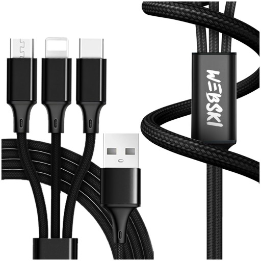 ☑️ ORYGINALNY WEBSKI Mocny kabel 3w1 z nylonowym oplotem 120cm do ładowania wszystkich urządzeń