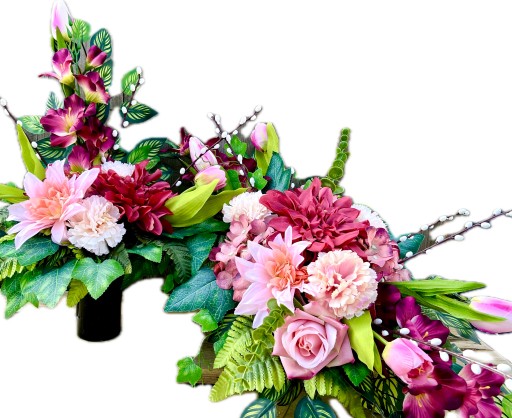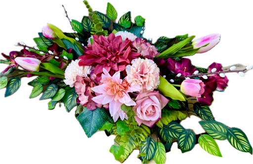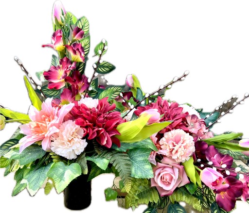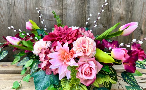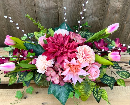 ✅ dekoracja kwiatowa w kolorystyce kremowo-różowo-fioletowej w skład której wchodzą liczne, sztuczne, urocze kwiaty: tulipany, gladiole, hortensje, róże, goździki, dalie,