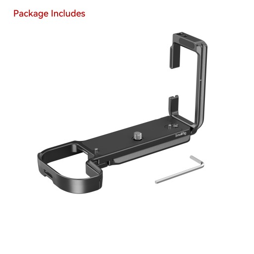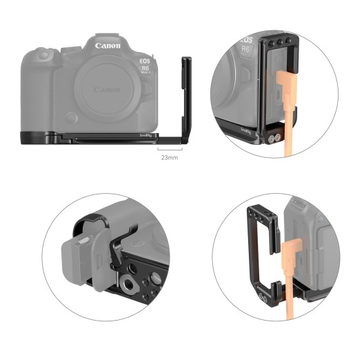 SmallRig L-Bracket do Canon EOS R6 Mark II / R5 / R5 C / R6 4160 został zaprojektowany, aby ułatwić przełączanie między trybami poziomym i pionowym oraz poprawić czucie uchwytu. Aparat jest mocowany za pomocą śruby 1/4"-20 na spodzie i dwóch kołków ustalających. Gumowe podkładki zapobiegają zarysowaniom, a przegubowe ramię na pokrywie baterii dostosowuje się do krzywizny kamery, aby poprawić chwyt. Istnieje kilka mocowań akcesoriów: płytka szybkiego zwalniania Arca-Swiss do statywów Arca lub stabilizatorów DJI RS 2 / RSC 2 / RS 3 / RS 3 Pro, otwory gwintowane 1/4 "-20 na spodzie do obsługi bocznego uchwytu 2093 i 3847 do pionowego fotografowania z ręki, płytka szybkiego zwalniania 1280 i otwory na pasek do paska ręcznego 3848 i 2456. Płytka posiada również gniazdo QD do mocowania systemu szybkiego odłączania paska na ramię, otwory gwintowane 1/4"-20 do mocowania mikrofonu BUC2736 Cold Shoe oraz rozszerzalną płytkę boczną umożliwiającą przejście kabla do zdjęć pionowych i obrót ekranu o 90 stopni z wycięciem. W zestawie znajduje się również klucz magnetyczny ułatwiający demontaż i montaż.