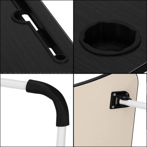 Stolik pod laptopa z przestronnym blatem został wyposażony w specjalne miejsca na tablet/telefon, w którym możesz bez problemu postawić urządzenie w pionie, bez obawy, ze się przewróci czy spadnie oraz specjalne wgłębienie na kubek, które zabezpiecza przed niechcianym wylaniem płynu na stojące obok urządzenia.
