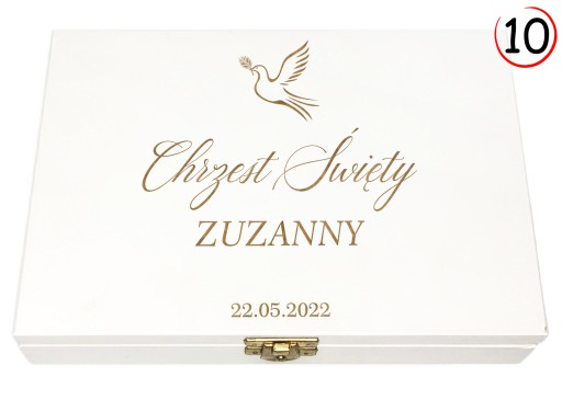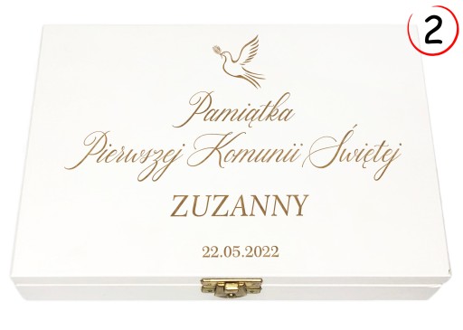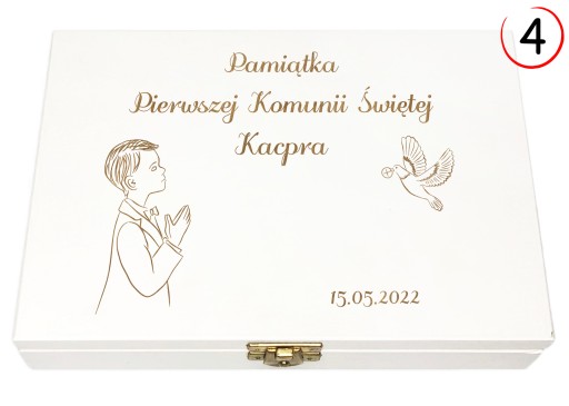 Drewniane pudełko z grawerem idealnie sprawdzi się jako dodatek do prezentu na Pierwszą Komunię lub Chrzest. W komplecie znajduje się sianko na którym wyeksponować można podarunki dla dziecka.