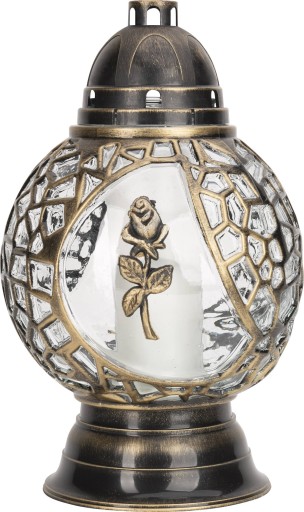 Nowoczesny design oraz okazała forma znicza podkreśla ważne chwile zadumy. Znicz o wysokości 31,5 cm zawiera wymienny wkład parafinowy o czasie palenia około 2 dni. Znicz ozdobny w kształcie kuli ze złoto - czarnymi elementami oraz kapturkiem i podstawką w tym samym kolorze. Złota róża na środku znicza dodaje eleganckiego wyglądu.