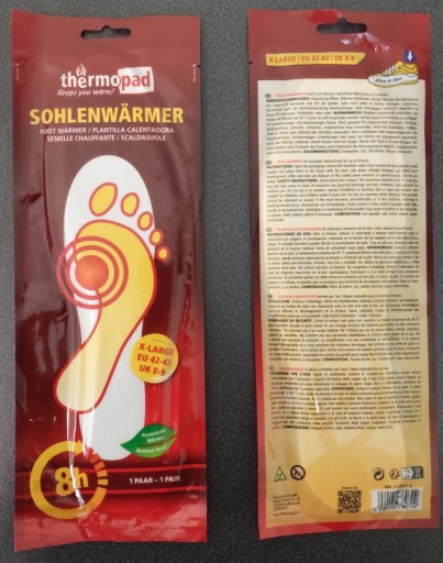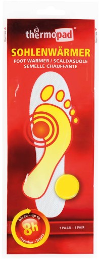 Ogrzewacze wkładek do butów Thermopad nadają się dla każdego – mogą być stosowane przez każdą osobę, która nie lubi mieć zimnych stóp lub chce uniknąć przeziębienia czy odmrożeń. Przykleja się je po zewnętrznej stronie skarpetek. Warstwa kleju zapewnia stabilne położenie w bucie. Można ich używać we wszystkich rodzajach butów, również narciarskich. Opakowanie zawiera dwie samoprzylepne saszetki, po jednej na każdą stopę. Ogrzewacze aktywują się poprzez potrząśnięcie: po wyjęciu z opakowania, w kontakcie z powietrzem, w ciągu 20 minut rozgrzewa się do temperatury 37oC (wartość średnia). Maksymalna temperatura wynosi 45oC. Ciepło w butach utrzymuje się do 8 godzin.