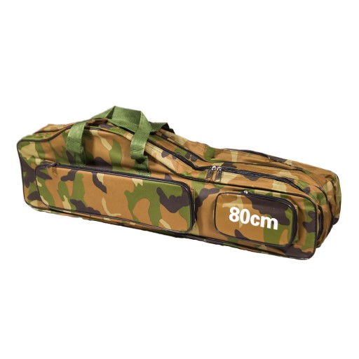 Pokrowiec ze sztywnego materiału w kolorze wojskowej moro z rączkami do noszenia oraz pasem na ramię. Posiada 2 komory po 80cm i jedną kieszeń boczną dodatkowo.