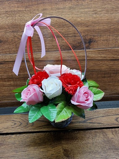 Uroczy Koszyk bukiet z różami mydlanymi różowymi niezwykły PREZENT upominek