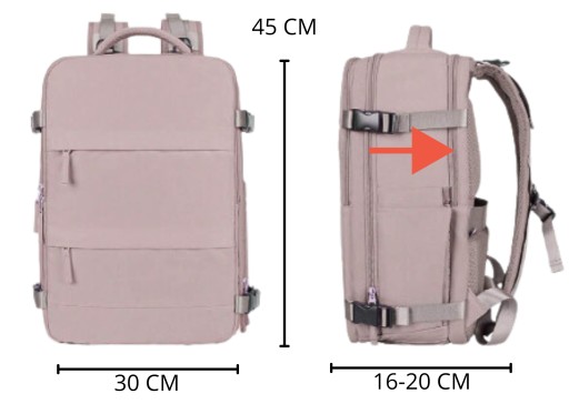 Plecak wykonany zgodnie z wymogami osobistego bagażu podręcznego (torba/plecak podręczny) dla linii Ryanair, Wizzair, Easy Jet a także Lufthansa, TUI FLY, Norwegian, Jet2, British Airways, Fly Emirates, Turkish Airlines.