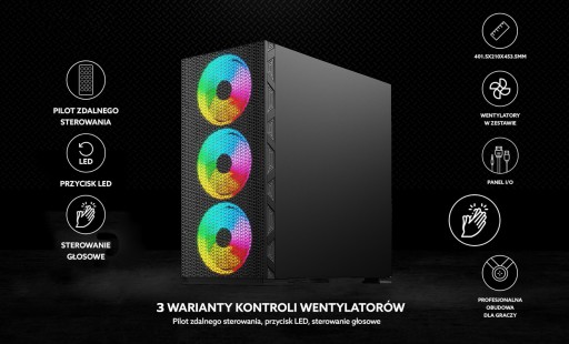 - System kontroli wentylatorów ARGB sterowany pilotem, przyciskiem na obudowie oraz za pomocą sterowania głosowego