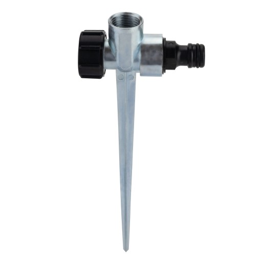 ⚙️Wbijany w ziemię długim, solidnym kolcem. Zraszacz posiada ręczną regulację sektora działania w postaci ograniczników i odbojnika, która umożliwia modyfikację kąta obrotu zraszacza od 30° do 360°. Aby uzyskać efekt 30° zraszania należy umieścić odbojnik pomiędzy ciasno ułożonymi ogranicznikami, natomiast aby zraszać 360° należy podnieść odbojnik do góry.