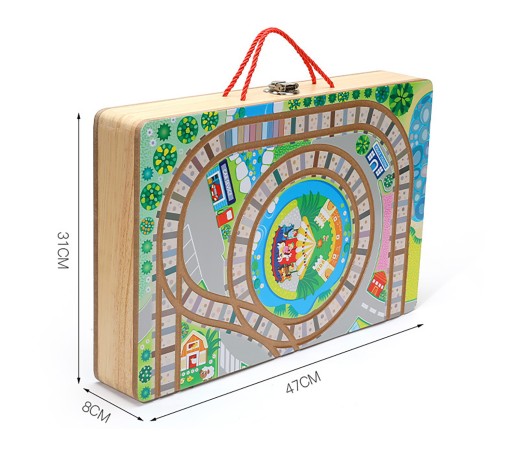 - Drewniana walizka 2w1, wewnątrz walizki mieści się cały zestaw klocków, pojazdów i elementów miasta. Strona zewnętrzna to plansza z drogą i torami.