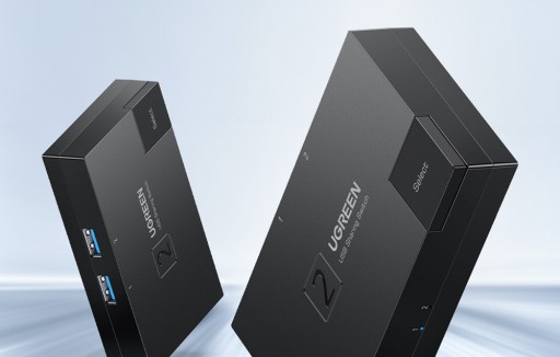 Inteligentny przełącznik USB CM618 marki Ugreen. Posiada 2 wejścia USB 3.0 oraz 1 wejście USB 3.0 i pozwala korzystać z jednego urządzenia peryferyjnego na dwóch komputerach lub z dwóch urządzeń na jednym komputerze. Przełącznik rozdziela dostęp do portów USB pomiędzy urządzenia za pomocą przycisku wyboru.