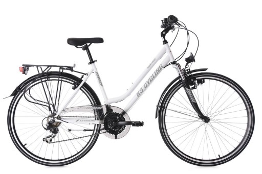 Sprzedam rower trekkingowy damski niemieckiej marki KS Cycling, model MONTREAL wyposażony w 21 biegów Shimano Tourney, amortyzowany widelec, błotniki, oświetlenie, kierownicę prostą.