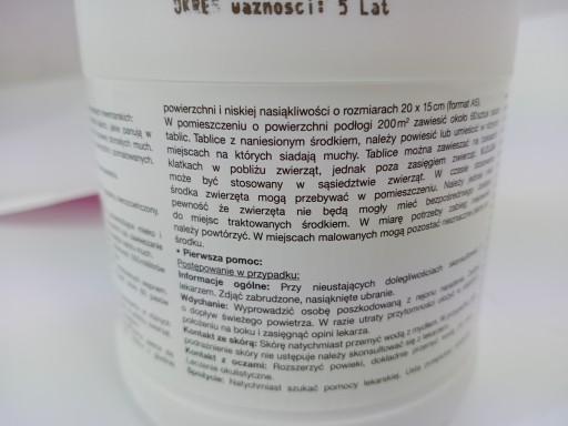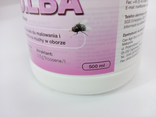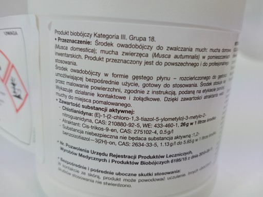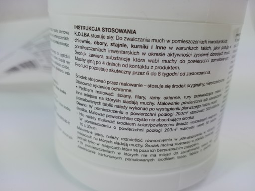 Gotowy do użycia środek przeznaczony do zwalczania much. Stosować przez malowanie bądź opryskiwanie powierzchni w pomieszczeniach typu obory, stajnie, chlewnie i inne budynki inwentarskie. Natychmiastowe działanie na owady. Okres działania: od 6 do 8 tygodni. Stosować bezpośrednio na czystych powierzchniach nie absorbujących środka, takich jak: ściany, filary, ramy okienne, rury przewodzące mleko i inne miejsca, na których siadają muchy lub na kartonowych tablicach pokrytych preparatem rozwieszonych w pomieszczeniu. Środek można stosować w pobliżu zwierząt, jednak tylko w miejscach, które są poza ich zasięgiem. Opakowanie 500 ml wystarcza na pomieszczenie o powierzchni do 200 m2. Oprysk: 500 ml produktu rozpuścić w 1 litrze wody Produkt biobójczy* *Należy zachować szczególną ostrożność przy korzystaniu z biocydów! Przed użyciem należy zapoznać się z etykietą.