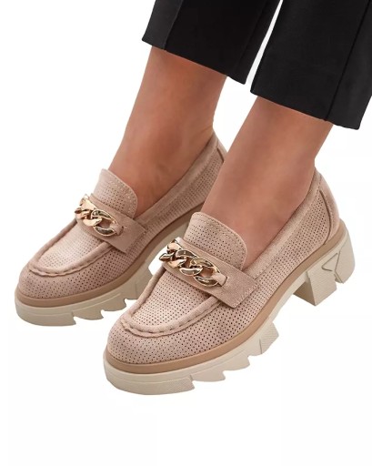 Przepiękne damskie mokasyny na masywnej podeszwie. Model w tylu casual, jest wykonany ze skóry ekologicznej zamszowej z ażurowym wykończeniem, a wkładka to skóra naturalna. Na nosku złota ozdoba. Idealne do tworzenia stylowych outfitów!