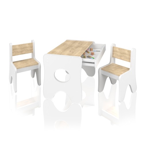 Stolik i dwa krzesełka dla dziecka – oryginalny styl w dziecięcym wnętrzu. Meble dla dzieci zaprojektowane z myślą o bezpieczeństwie, wygodzie i prawidłowym rozwoju najmłodszych. Odpowiednio dobrane krzesełko ze stolikiem to świetny sposób na wykreowanie miejsca, które stanie się bezpieczną przestrzenią dla dzieci. Stolik i krzesełka dla dziecka to fundament zabawy, który uwolni wyobraźnię, tworząc idealne warunki do rozwoju każdego małego artysty. Mebelki wykonane są z certyfikowanych materiałów, wysokiej jakości płyty meblowej laminowanej, wszystkie narożniki są zaokrąglone by użytkowanie mebelków było bezpieczne dla naszych pociech, zaletą jest nowoczesna i bardzo stabilna konstrukcja oraz szuflada pod stolikiem gdzie dziecko może w każdej chwili coś schować albo coś wyjąć by móc bez ograniczeń kreować swoją zabawę.W zależności od potrzeb, stół sprawdzi się do nauki, malowania, zabawy czy spożywania posiłków.