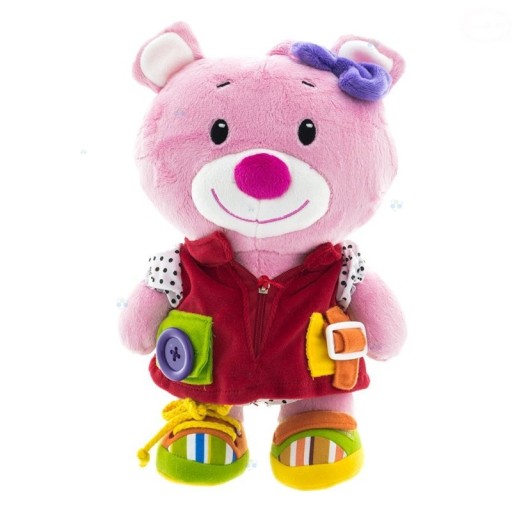 Ta miękka zabawka pomoże rozwinąć dziecku zmysł dotyku, wzroku oraz słuchu. Uczy dziecko zapinania bucików na rzepy, a także zapinać guziki, klamerki, zasuwania zamka. Twoje dziecko z pewnością polubi interesujące kolory, różne materiały oraz dźwięki.