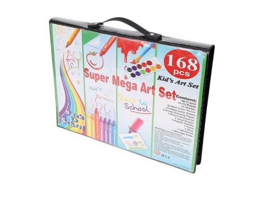 168 ELEMENTÓW – przy pomocy ogromnego wyboru 24 kredek, 24 mazaków, 48 pasteli olejowych, 48 pasteli świecowych, 12 farb akwarelowych, temperówki, kleju, korektora, gumki do mazania, kartek a4 z łatwością stworzymy najbardziej wymyślne, kreatywne i oryginalne prace.