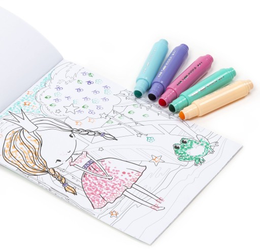 Zestaw zawiera 10 arkuszy z magicznymi obrazkami wróżek, które czekają, aby ożyły kolorami oraz 5 dwustronnych flamastrów - każdy w pastelowych kolorach: różowym, niebieskim, fioletowym, żółtym i zielonym. Dzięki nim, dzieło Twojego dziecka nabierze wyjątkowego uroku. Końcówka flamastrów jest specjalnie zaprojektowana - zaokrąglona i krótka, co sprawia, że malowanie kropek staje się łatwe i przyjemne. Co więcej, stempelek na drugim końcu pisaka jest samotuszujący, dzięki czemu nie trzeba używać dodatkowej poduszki z tuszem.