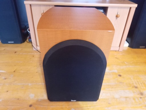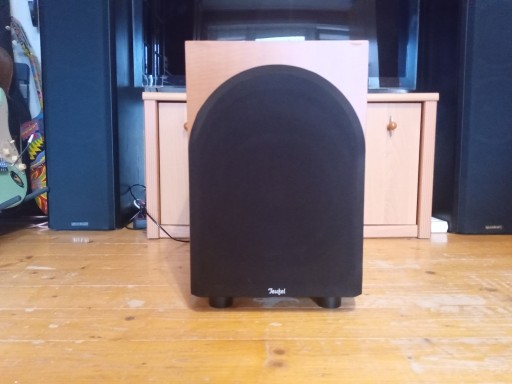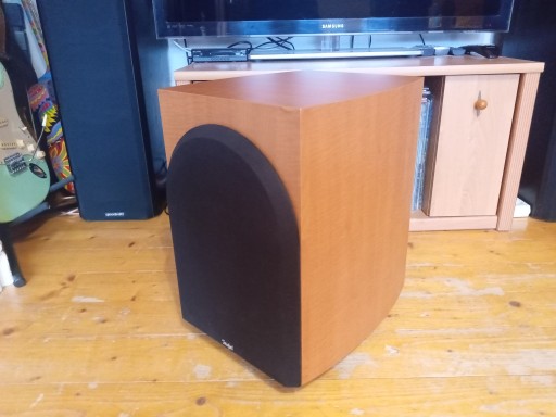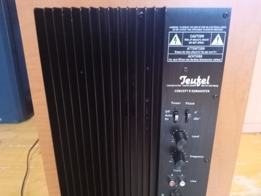 Używany, sprawny duży subwoofer aktywny Teufel Concept R Subwoofer o mocy 100W. Wizualnie w ładnym stanie. Ma niewielki pęcherzyk powietrza na górnym kancie. Wymiary 46 x 42 x 35 cm.