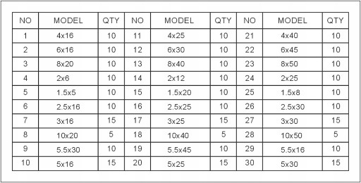 Zestaw zawiera rozmiary od 1.5x5 mm do 10x50 mm.