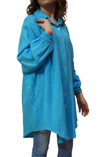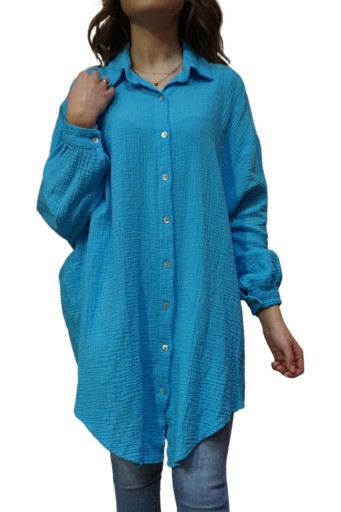 Stylowa koszulowa muślinowaz długim rękawem. Tunika wykonana z przyjemnego lekkiego przewiewnego materiału, dzięki czemu zapewnia komfort noszenia. Sprawdzi się z jeansami, idealna także na kostium kąpielowy.