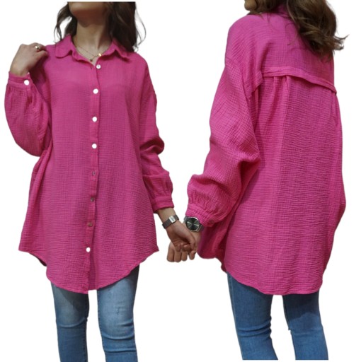 ДЛИННАЯ СВОБОДНАЯ МУСЛИНОВАЯ РУБАШКА ОВЕРСАЙЗ ЖЕНСКАЯ ТУНИКА С ДЛИННЫМ РУКАВОМ ФУКСИЯ