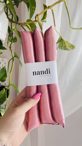 Papiloty są wykonane w całości z satyny syntetycznej o śliskiej powierzchni. Wypełnienie stanowi antyalergiczna kulka silikonowa.