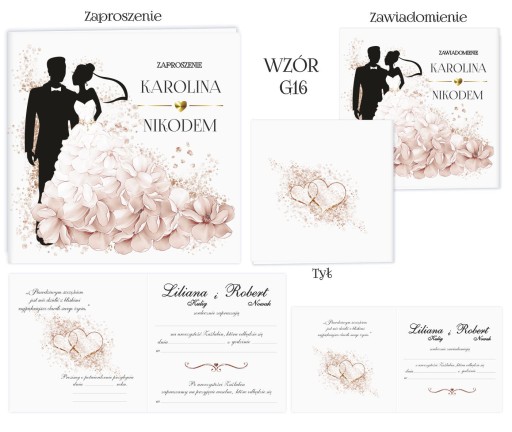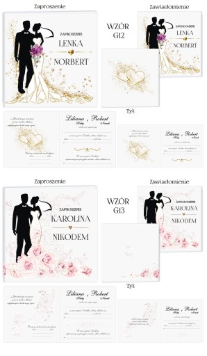 - zaproszenie lub/i zawiadomienie wybrane wzory takie jak prezentujemy na aukcji gotowe do wypisania. Personalizujemy jedynie Imiona i nazwiska Pary młodej inne dane wypisują Państwo własnoręcznie