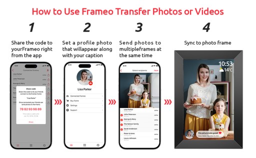 - ⭐【Udostępniaj zdjęcia i filmy prywatnie i bezpieczne】 . Wysyłam zdjęcia lub krótkie filmy (maks. 15 sekund) bezpośrednio do aplikacji FRAMEO z dowolnego miejsca na świecie, a przyjaciele i rodzina mogą być przechowywanymi pięknymi chwilami w ciągu kilku sekund na cyfrowych ramkach na zdjęciach . W ten sposób można zapewnić źródło i sieć udostępniania zdjęć dla rodziny i przyjaciół.