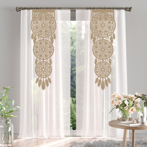 Firanka ma rozmiar 140x250cm z taśmą, w komplecie szarfa do podwiązania firanki w rozmiarze 150x10 cm.