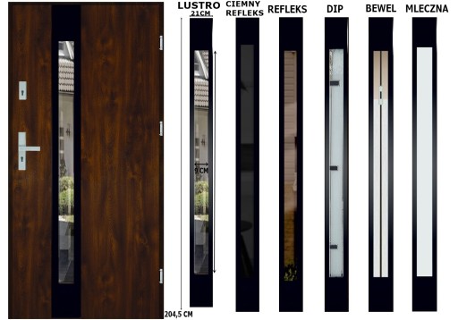 MODEL DRZWI INOX 4 BLACK KOLOR ORZECH SZYBA LUSTRO WENECKIE, CIEMNY REFLEKS, REFLEKS, DIP, BEWEL, MLECZNA+WYMIARY PRZESZKLENIA I ZDOBIEŃ :