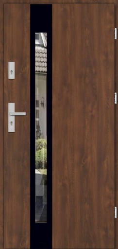 Drzwi wykonane zostały z blachy pokrytej folia dekoracyjną PCV co sprawia, że idealnie pasującą do stolarki okiennej.