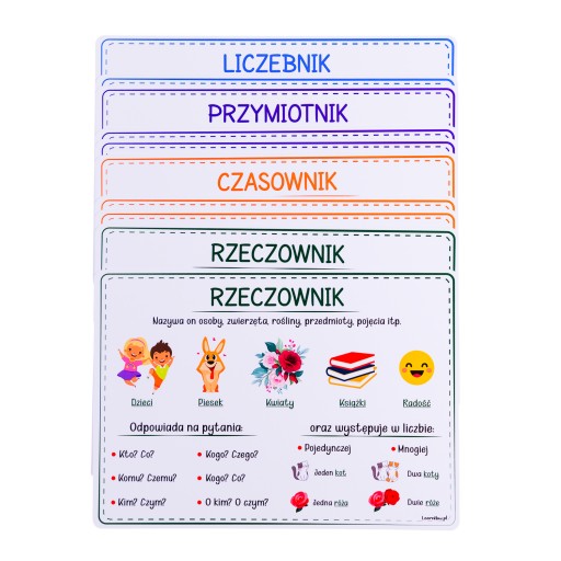 Części mowy jakie zawiera zestaw: rzeczownik, czasownik, przymiotnik, liczebnik.